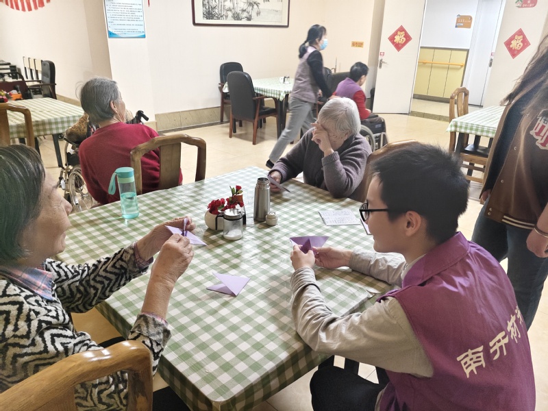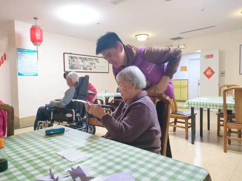 志愿者教老人叠千纸鹤,手把手耐心指导。从纸张的折叠,到边角的按压,每个步骤都细致讲解。当一只只千纸鹤在老人手中成型,他们脸上绽放出灿烂的笑容。