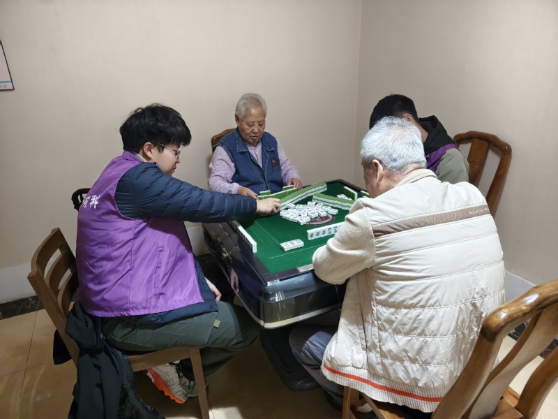 志愿者和老人们围坐在牌桌旁,小小的牌桌充满欢声笑语,每一次出牌都是两方情感的交流。