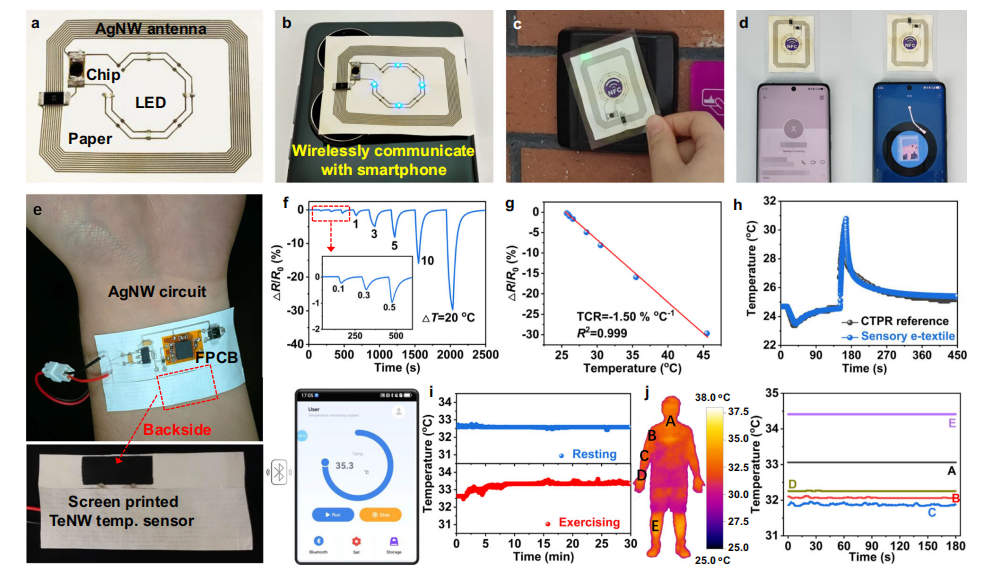 图4展示了基于HPMs-AgNW墨水及其他纳米线墨水的印刷柔性电子产品应用实例。一是用13.2 wt.% NHPM-AgNW IPA墨水在纸基板上丝网印刷电极和天线,制成NFC标签,该标签能通过智能手机无线能量传输点亮4个LED,还可用于电子门锁门禁卡、个人信息识别标签及控制手机应用程序。二是构建了用于实时监测人体体温变化的可穿戴电子纺织品(e-textile),它由丝网印刷的AgNW电路、基于TeNW的温度传感器、内置蓝牙模块的柔性印刷电路板和纺织基板组成。其中,温度传感器由16.7 wt.% NHPM-TeNW H₂O墨水印制,其电导率随温度变化,具有-1.5 %°C⁻¹的高电阻温度系数(TCR)和0.1°C的传感分辨率,能精准测量体温并实时传输至智能手机,且在不同身体部位和运动状态下均能稳定监测。