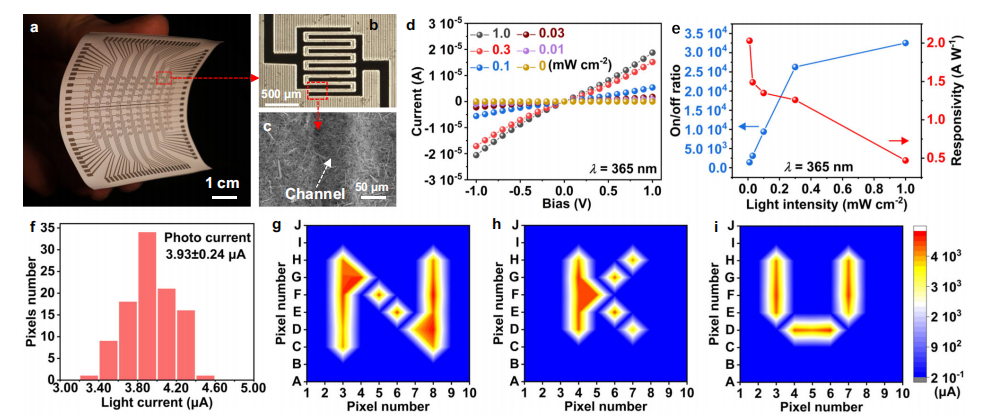 图5主要呈现了基于AgNW和ZnONW构建的印刷光探测器阵列的相关情况。以AgNW作为叉指电极,通过狭缝模涂NHPM-AgNW IPA墨水(固含量7.1 wt.%)并激光蚀刻制成,再用9.2 wt.% NHPM-ZnONW IPA墨水丝网印刷在叉指电极上构建出10×10像素的UV光探测器阵列。从微观结构看,ZnONW均匀覆盖叉指电极和通道。其光电性能方面,在不同强度365nm UV光照下,光探测器的I-V曲线呈现良好的欧姆接触特性,在0.1 mW cm⁻²光照、1V偏压下,器件响应度达1.35 A W⁻¹ ,光暗电流比超9400,性能优于多数已报道的ZnO基光探测器。对100个像素的输出电流评估显示其均匀性良好,用设计的“N”“K”“U”图案掩模覆盖阵列,在0.1 mW cm⁻²光照、1V偏压下,可从光电流映射结果清晰识别这些字母图案。