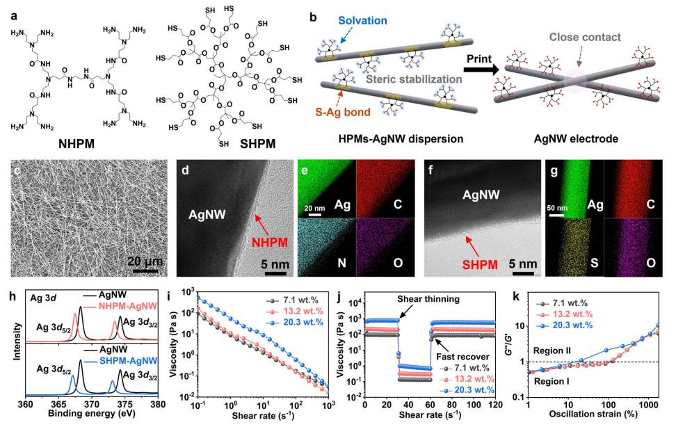 HPMs凭借三维结构及外围官能团,与AgNW形成强配位键,少量即可实现其在多种溶剂中的高固含量稳定分散,且储存性良好。该墨水粘度低、具备剪切变稀触变性和独特粘弹性,利于印刷操作。印刷时无需苛刻后处理,能在多种柔性基板上实现高分辨率图案印刷。此外,此策略对多种功能纳米线都适用,基于该墨水制造的各类柔性电子器件性能优异,在可穿戴电子领域应用前景广阔。