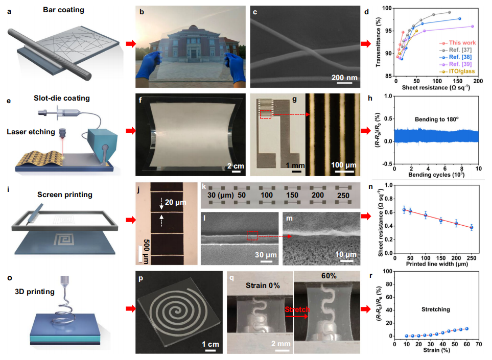 图3主要呈现了HPMs-AgNW墨水的可印刷性。通过不同印刷方法,如棒涂、狭缝模涂、丝网印刷和挤出式3D打印,在各类柔性基板上印刷不同浓度的HPMs-AgNW墨水。棒涂1 wt.% NHPM-AgNW IPA墨水制备的透明电极,展现出优异的光电性能,其方块电阻为17.1Ω sq⁻¹ ,透过率达94.7%。狭缝模涂7.1 wt.% NHPM-AgNW IPA墨水形成的柔性导电膜,经激光刻蚀构建的图案在10,000次180°弯曲循环后导电性无下降。丝网印刷13.2 wt.% NHPM-AgNW IPA墨水能印制出高分辨率、均匀且导电性良好的图案,如30μm宽线条的方块电阻低至0.64Ω sq⁻¹ ,对应电导率达6.2×10⁴ S cm⁻¹ 。20.3 wt.% NHPM-AgNW IPA墨水通过挤出式3D打印在不规则表面构建复杂图案,如在PDMS基板上打印的蛇形图案电极,在60%应变下仍能保持稳定导电性,充分展示了该墨水在不同印刷方式下的良好适应性和所制得图案的高性能。