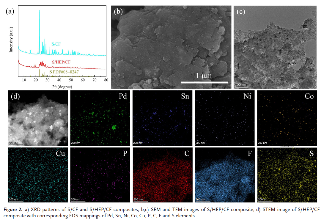 高熵金属磷化物(HEP)催化剂的创新应用:通过将高熵金属磷化物(Pd₀.₃₄Sn₀.₁₅Ni₀.₀₅Co₀.₉Cu₀.₂₉P₀.₀₈)原位沉积在CF材料表面,显著增强了硫的转化反应和电极的导电性。