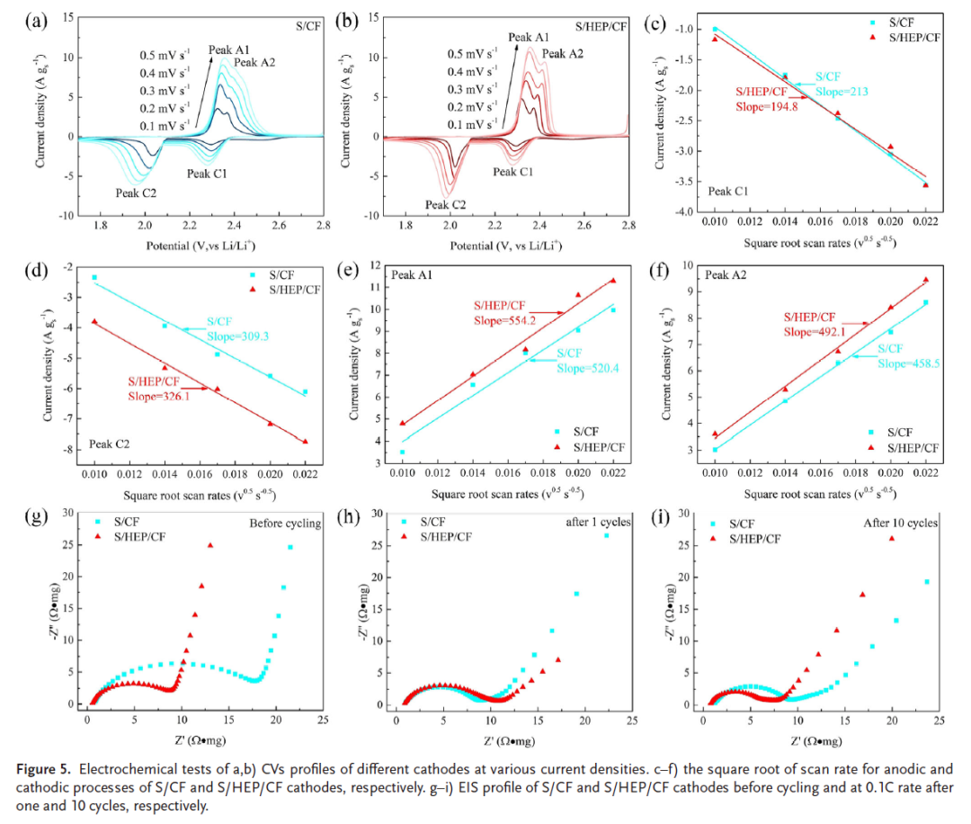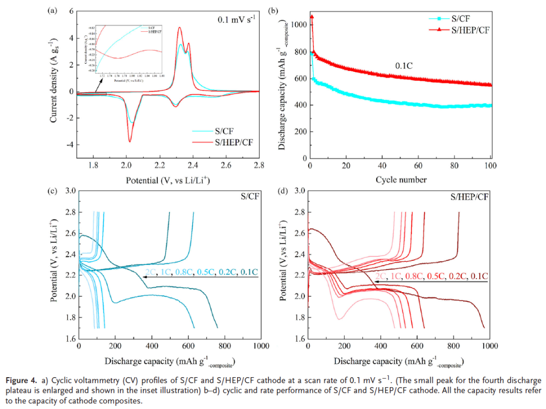 显著提升的初始放电容量和速率性能:采用S/HEP/CF复合正极材料的电池,在0.1C速率下实现了1059.2 mAh g⁻¹的初始放电容量,在2C速率下仍能保持476.5 mAh g⁻¹的高放电容量,显示出卓越的快充性能。