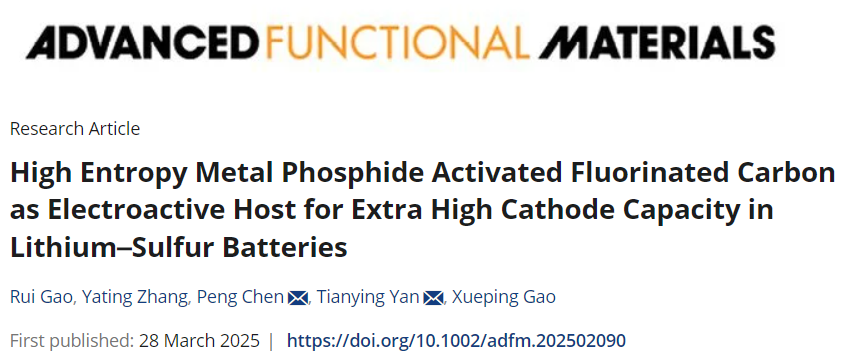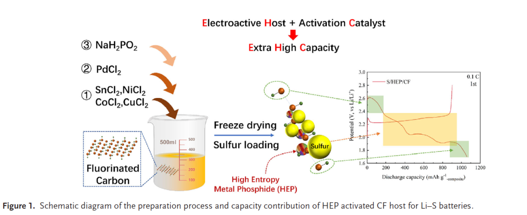 题目:High Entropy Metal Phosphide Activated Fluorinated Carbon as Electroactive Host for Extra High Cathode Capacity in Lithium–Sulfur Batteries