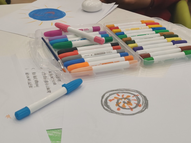 冥想结束后,老师再次让大家拿起画笔创作,许多同学的画作有了明显的变化,色彩变得更加柔和,内容变得更加自由,这或许就是心灵得到舒缓的体现。