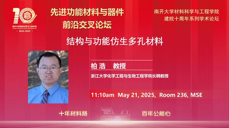 报告人简介:柏浩,浙江大学化学工程与生物工程学经理聘教授、博士生导师,现任浙江大学党委委员、共青团浙江大学委员会书记。兼任中国材料研究学会纤维材料改性与复合技术分会常务理事、中国化学会仿生材料化学专业委员会委员、中国复合材料学会微纳米复合材料专业委员会常务委员,以及Chinese Chemical Letters、中国科学·技术科学、Advanced Fiber Materials等青年编委。研究方向涉及:(1)冰模板技术原理及其在材料多尺度结构调控方面的应用 (2)仿北极熊毛的多孔隔热织物(3)受墨鱼骨启发的高机械效率多孔材料(4)仿木材多孔塑料 (5)仿贝壳结构层状复合材料。与合作者一起系统研究了蜘蛛丝和仙人掌表面的定向集水性能,揭示了生物材料表面微结构与其浸润特性之间的关系,并利用多种物理、化学方法,制备开发了一系列模拟天然蜘蛛丝和仙人掌表面浸润特性的仿生智能界面材料。另外,通过对生物材料优异力学性能的仿生研究,发展了冰模板法和三维打印等方法,用于轻质、高强、增韧仿生结构材料和生物支架材料的开发,取得了多项有重要意义的成果。