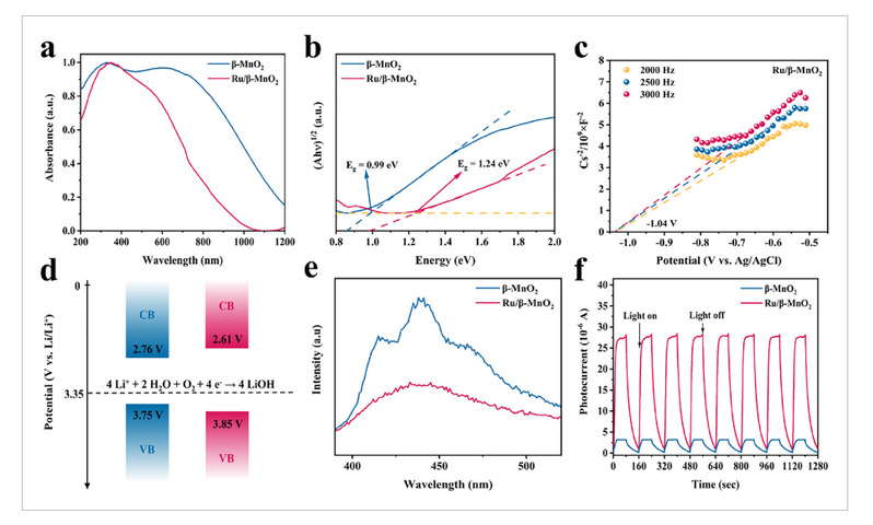 图3.a)β-MnO₂和Ru/β-MnO₂的固态UV–vis吸收光谱。b)β-MnO₂和Ru/β-MnO₂的Tauc图(禁带宽度计算图)。c)Ru/β-MnO₂的M-S曲线。d)β-MnO₂(蓝色)和Ru/β-MnO₂(红色)相对于Li/Li+的能带结构。e)β-MnO₂和Ru/β-MnO₂的PL光谱。f)β-MnO₂和Ru/β-MnO₂在氙灯照射下的瞬态光电流响应。