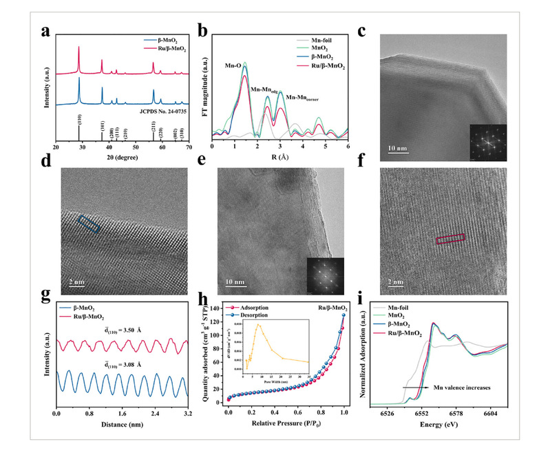 图1.a)β-MnO₂和Ru/β-MnO₂的XRD图谱。b)Mn K边的XANES光谱。c)和e)分别为β-MnO₂和Ru/β-MnO₂的HAADF-STEM图像;插图显示相应的选区电子衍射(SAED)图案。d)和f)中的高分辨率HAADF-STEM图像分别从c)和e)的局部区域采集。g)β-MnO₂和Ru/β-MnO₂的像素强度积分图,分别取自d和f中蓝色和红色矩形区域。h)Ru/β-MnO₂的吸脱附等温线及孔径分布表征。i)K边的FT-EXAFS光谱。