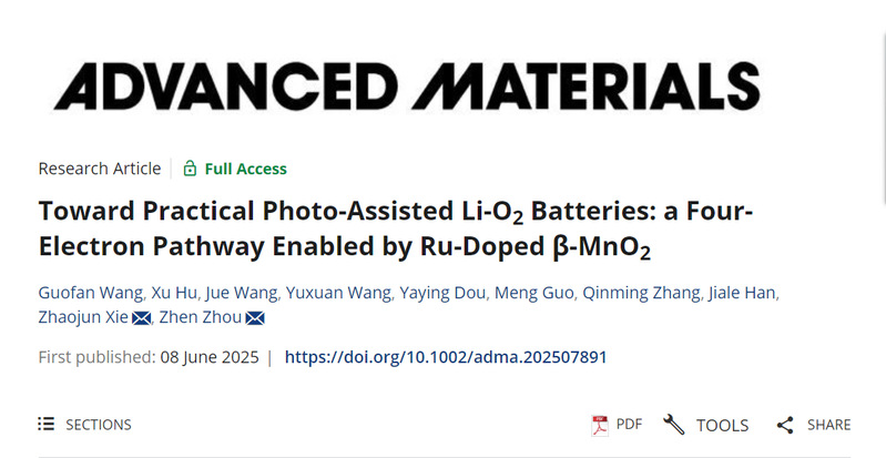 2025年6月8日,betway西汉姆联官网谢召军团队在Advanced Materials期刊发表题为“Toward Practical Photo-Assisted Li-O2 Batteries: a Four-Electron Pathway Enabled by Ru-Doped β-MnO2”的研究论文,团队成员王国凡为论文第一作者,谢召军、郑州大学周震为论文共同通讯作者。