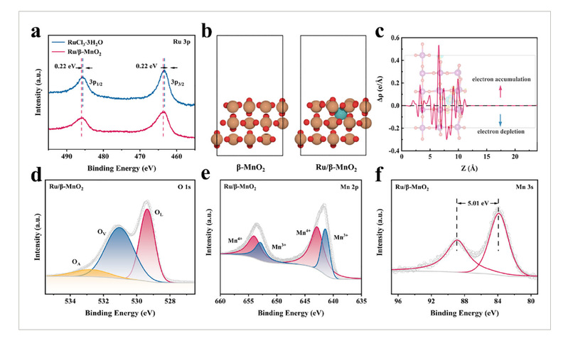 图2.a)Ru/β-MnO₂的高分辨率Ru 3p XPS能谱与RuCl₃∙3H₂O的对比。b)β-MnO₂(110)和Ru/β-MnO₂(110)的原子结构示意图。Mn为橙色,O为红色,Ru为青色。c)Ru/β-MnO₂(110)的平面平均电荷密度差图。插图为等表面能级0.015 e Å⁻³的三维电荷密度差图,青色和黄色区域分别表示电子耗尽和积累。d–f)Ru/β-MnO₂的高分辨率O 1s、Mn 2p和Mn 3s XPS谱图(分别对应d、e、f)。