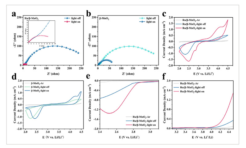 图4.a)Ru/β-MnO₂和b)β-MnO₂在有/无光照条件下的奈奎斯特图。c)Ru/β-MnO₂和d)β-MnO₂的CV曲线(扫描速率:0.1 mV s⁻¹)。e)ORR和f)OER的LSV曲线(Ru/β-MnO₂,扫描速率:0.1 mV s⁻¹)。