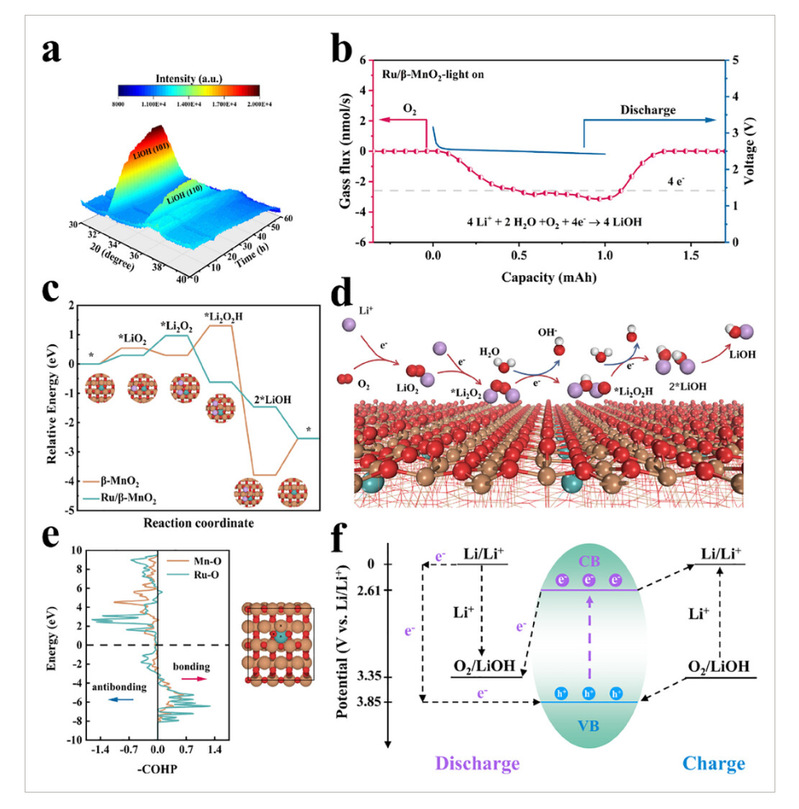 图6.a)光照下Ru/β-MnO₂光阴极充放电后的原位XRD图谱。b)光照下Ru/β-MnO₂电池的原位放电DEMS。c)相对于SHE 0 V时,β-MnO₂(110)和Ru/β-MnO₂(110)表面生成LiOH的反应能量曲线。插图为Ru/β-MnO₂(110)表面各对应中间体的原子结构(H为白色,Li为紫色)。d)Ru/β-MnO₂光阴极放电路径示意图。e)Ru/β-MnO₂(110)中O原子与邻近Ru和Mn原子的COHP。f)光辅助锂氧电池(相对湿度:57%)中LiOH生成与分解机理图。