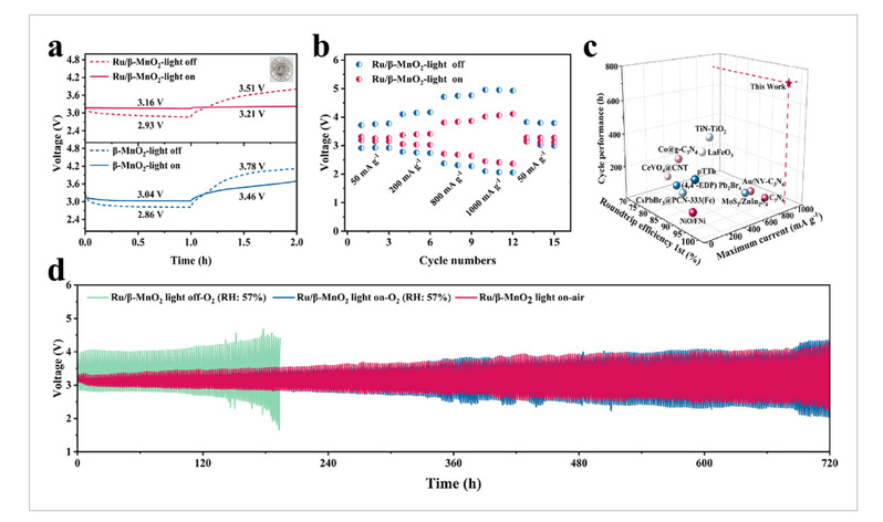 图5.a)Ru/β-MnO₂电池在50 mA g⁻¹电流密度下的充放电曲线。b)Ru/β-MnO₂电池的充放电倍率性能。c)使用Ru/β-MnO₂光阴极的锂氧电池与先前报道的高性能光辅助锂氧电池的对比分析。d)Ru/β-MnO₂电池在氧气环境(相对湿度:57%)及有/无光照条件的空气中、50 mA g⁻¹电流密度下的循环性能。