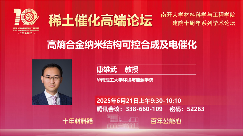 报告人简介:康雄武,华南理工大学,教授/博导。本科毕业于中国科学技术大学(2007),博士毕业于美国加州大学-圣克鲁兹分校(2012),于2012-2015年间在佐治亚理工化学系从事博士后研究。2015年至今,任华南理工大学教授,主要从事功能纳米材料(高熵合金、金属单原子催化)可控制备与合成,以及基于PEM的高性能电解水制氢、氢燃料电池及Zn-CO2电池器件开发。以项目负责人承担国家自然科学基金青年基金、大科学装置联合基金培育项目、面上项目、广东省自然科学基金项目;已经在Joule、JACS、Adv. Mater.、Angew. Chem、ACS Cataly.、Nano Lett.、Adv. Sci.、Energy Storage Mater.、Small、J. Mater. Chem. A、等期刊以第一作者或通讯作者发表论文五十多篇,总引用4000多次。现担任中国化学会电化学委员会期刊《电化学》、《结构化学》青年编委、IAAM Fellow,获得IAAM Scientist Metal。