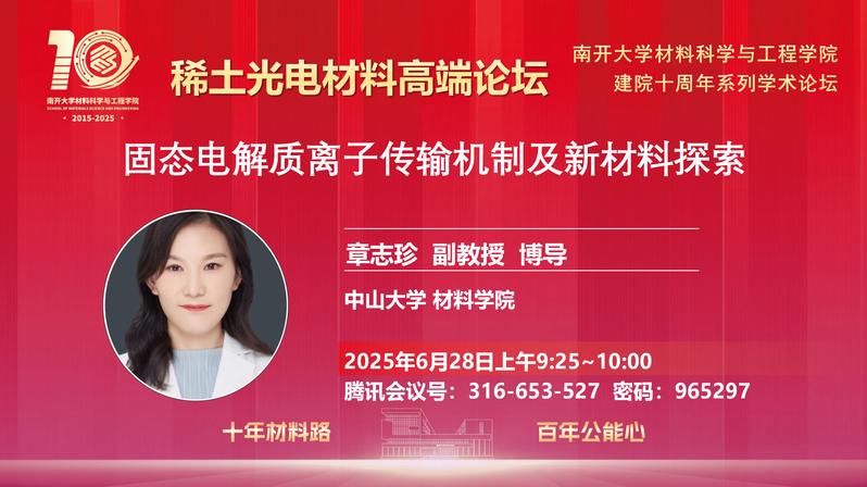 报告人简介:章志珍,中山大学材料学院副教授,博士生导师,获批深圳市海外高层次人才。2016年于中科院物理所获得博士学位,导师为胡勇胜研究员/陈立泉院士,之后在加拿大滑铁卢大学Linda Nazar院士组从事博士后研究,2020年至今在中山大学任教。长期从事新能源材料、固态电化学、凝聚态物理交叉领域的前沿研究。主持了包括国家自然科学基金、深圳市及宁德时代等多项纵向和横向课题。发表学术论文40多篇,其中一作/通讯作者论文包括能源、材料、化学类国际顶级学术期刊Nat. Rev. Mater., J. Am. Chem. Soc., Energy Environ. Sci., Adv. Energy Mater., Matter, Nat. Commun., Sci. Adv.等。多篇一作论文被选为ESI高被引论文和/或热点论文,单篇引用1000多次。
