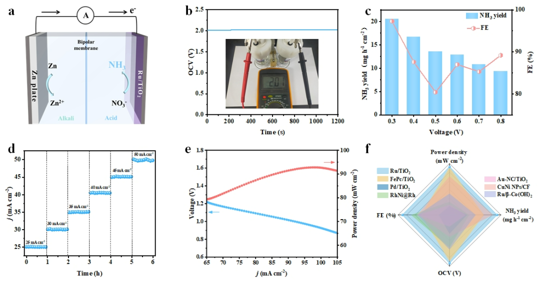 3. 构建了高功率密度的碱酸混合硝酸锌电池,可以实现同时绿氨生产和能量供应。
