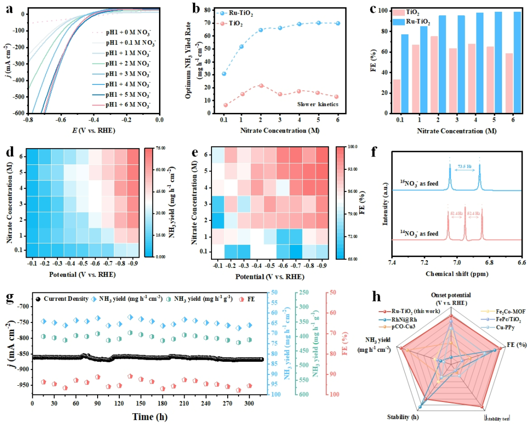 电催化硝酸盐还原产氨(NO3RR)为减少硝酸盐污染物和绿色产氨提供了可靠途径。目前大多数研究都集中在低硝酸盐浓度范围下的碱性/中性介质中的NO3RR,而关于在高浓度酸性电解质下进行 NO3RR 的研究却鲜有报道,这忽略了大多数含硝酸盐工业废水的强酸性环境,也与实际大规模生产的需求相悖。本文中,作者合成了Ru掺杂的TiO2纳米阵列(Ru-TiO2),利用杂原子掺杂导致的对电子结构与晶格应变的协同调控,Ru-TiO2在宽硝酸盐浓度范围(0.1−6 M)内展现了出色的酸性NO3RR性能。此外,用其组装的碱酸混合硝酸锌电池,开路电压高达2.01 V,功率密度为92.8 mW cm-2。
