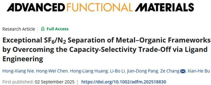 2025年9月2日,betway西汉姆联官网卜显和院士、常泽教授团队在Advanced Functional Materials期刊发表题为“Exceptional SF6/N2 Separation of Metal-Organic Frameworks by Overcoming the Capacity-Selectivity Trade-Off via Ligand Engineering”的研究论文,该研究采用配体工程策略,通过使用结构相似的四羧酸配体进行等网状化学合成,构筑了一系列Al-MOFs,实现了系统且精确的孔径优化与表面功能化,从而增强了SF₆的结合亲和力,以实现SF₆与N₂的高效分离。化合物4在低压下表现出高SF₆吸附量(10kPa时为55cm3/g⁻¹)和高SF₆/N₂选择性(选择性为512),优于目前大多数已报道的MOFs材料。此外,DFT计算证实了SF6高效捕获机制,动态穿透显示了Al-MOFs的实际分离效果,该工作突显了MOF中孔工程在克服选择性-吸附量权衡方面的潜力,为SF₆管理提供了可持续解决方案。