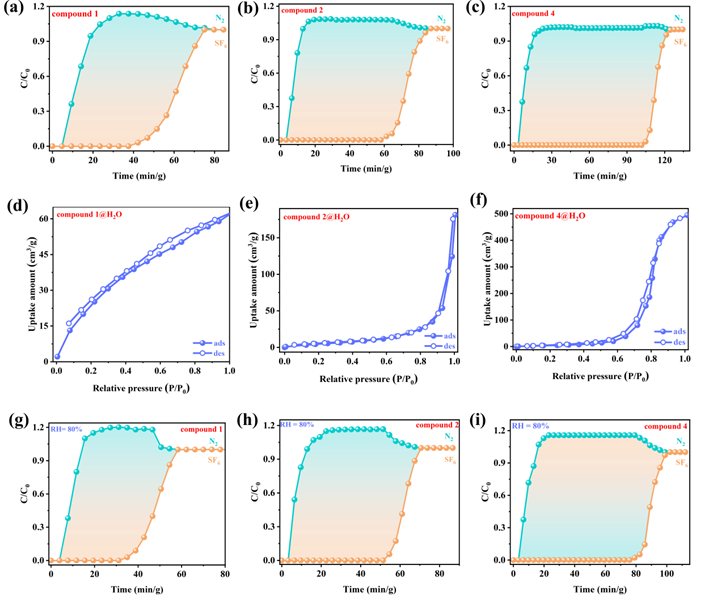 图4. 在298K和100 kPa条件下化合物1、2和4的突破实验研究。(a)在298K和100kPa条件下,化合物1对二元SF6/N2(10/90,体积比)混合物进行分离;(b)在298K和100kPa条件下,化合物2对二元SF6/N2(10/90,体积比)混合物进行分离;(c)在298K和100kPa条件下,化合物4对SF6/N2(10/90,体积比)混合物进行分离;(d)-(e)分别收集化合物1、2和4在298K条件下水吸附-脱附等温线;(h)至(j)在相对湿度为80%的条件下对10/90 SF6/N2混合物进行动态分离。
