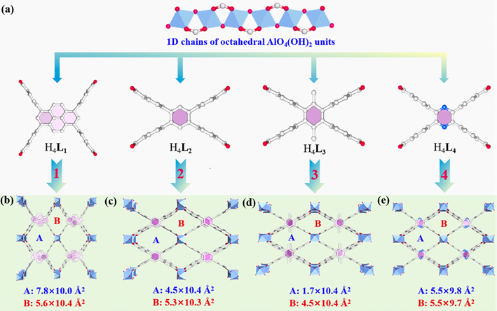 图1. (a)系列Al-MOFs的组成。(b)-(e)化合物1、2、3和4的孔隙结构分别显示了两种类型的通道,孔隙A和孔隙B,以及通过考虑原子的范德华半径计算出的孔径。