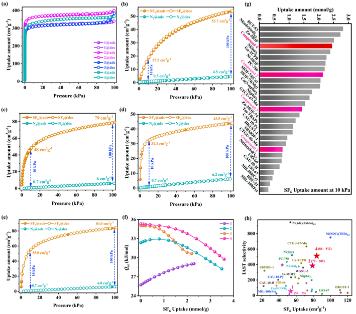 图2. (a)77K下的N2吸附和脱附等温线。(b)-(e)化合物1、2、3和4在298K下的SF6和N2吸附和脱附等温线。(f)基于不同温度下化合物1、2、3和4对于SF6吸附热。(g)化合物1、2、3和4与已报道材料在低压区的SF6吸附量比较。(h)在100 kPa和298K下,化合物1-4与已报道的MOFs对10/90 SF6/N2混合物的IAST选择性比较。