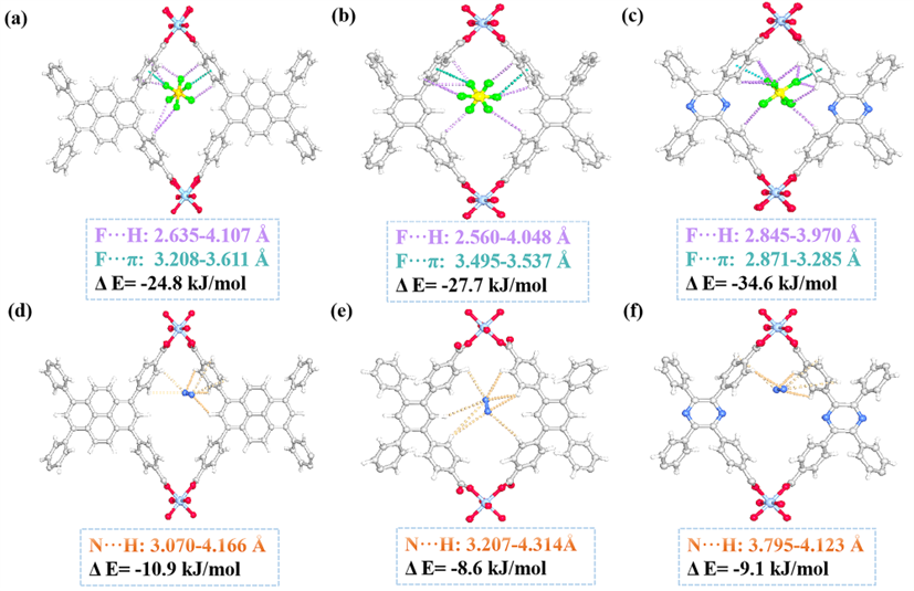图3. 基于DFT计算的SF6和N2在化合物1(a和d)、化合物2(b和e)以及化合物4(c和f)中优化后的气体分子结合位点的比较。