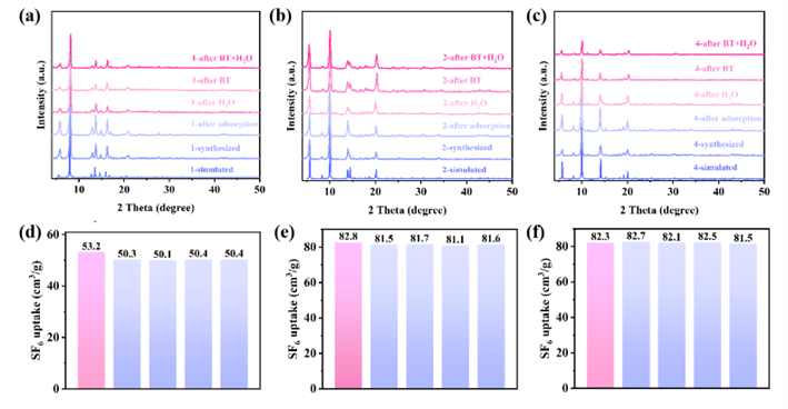 图5. (a)-(c)不同实验后化合物1、2和4结构完整性的表征。(d)-(f)穿透实验后化合物1、2和4的SF6吸附量。
