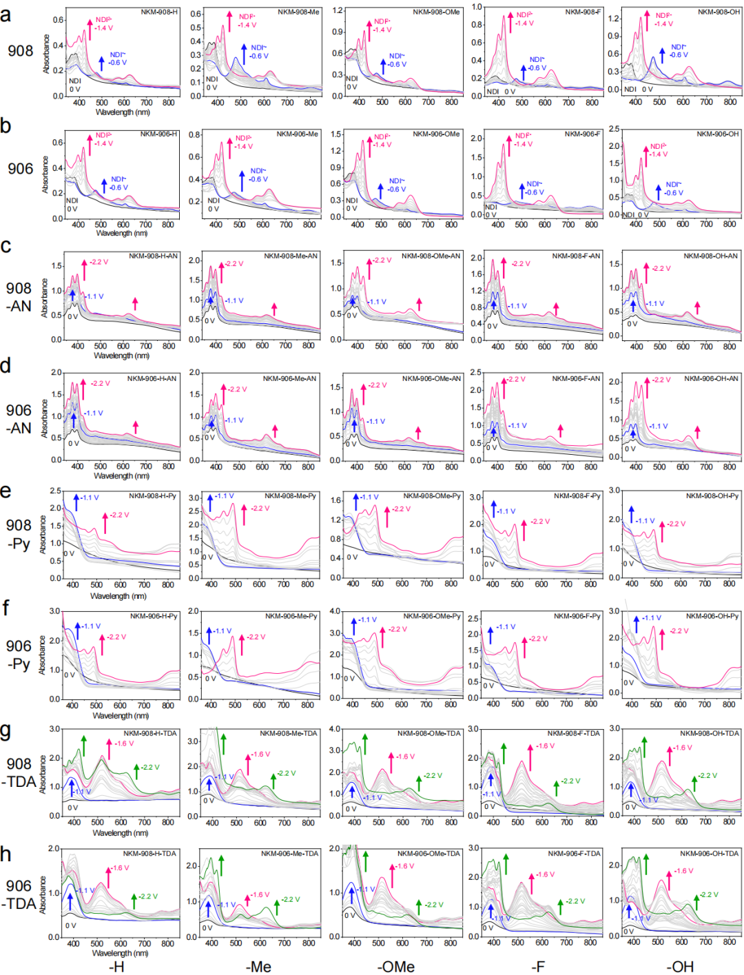 在这项工作中,含NDI主配体(R-linkers)的修饰是调节MOF电致变色的第一步。它特别强调修饰位于这些四位羧酸盐任一端的“可修饰外围区”中的外围官能团(R-基团),同时保持变色NDI核心不变,以在所有R-配体之间实现一致的形状和大小。在相似条件下成功合成了五种新的NKM-908-R产物(R=H、Me、OMe、F或OH),以及通过简单修改调节剂的量可以获得一系列纯度极高的NKM-906-R(R=H、Me、OMe、OH和F)。根据成功测定的一系列材料的单晶X射线衍射(SCXRD)结构与粉末X射线衍射(PXRD)图谱,可以得出结论,整个NKM-908(csq拓扑结构)与NKM-906-R(scu拓扑结构)系列共享相同的(4,8)连接。同时,由于scu拓扑的NKM-906-R在相邻的Zr6O8节点之间具有两种形式的配位不饱和口袋,其大小相似(在菱形或细长六边形通道内,沿a-/c轴的Zr··-Zr距离分别约为12.67/16.13 Å;请注意,前者是柔性的),而NKM-908-R在其csq拓扑中只有一种这样的配置(Zr··-Zr:15.57Å沿c轴;图1e)。这导致NKM-906-R可能在口袋内可能安装更大量的氧化还原辅助配体,进而可能影响电致变色行为。