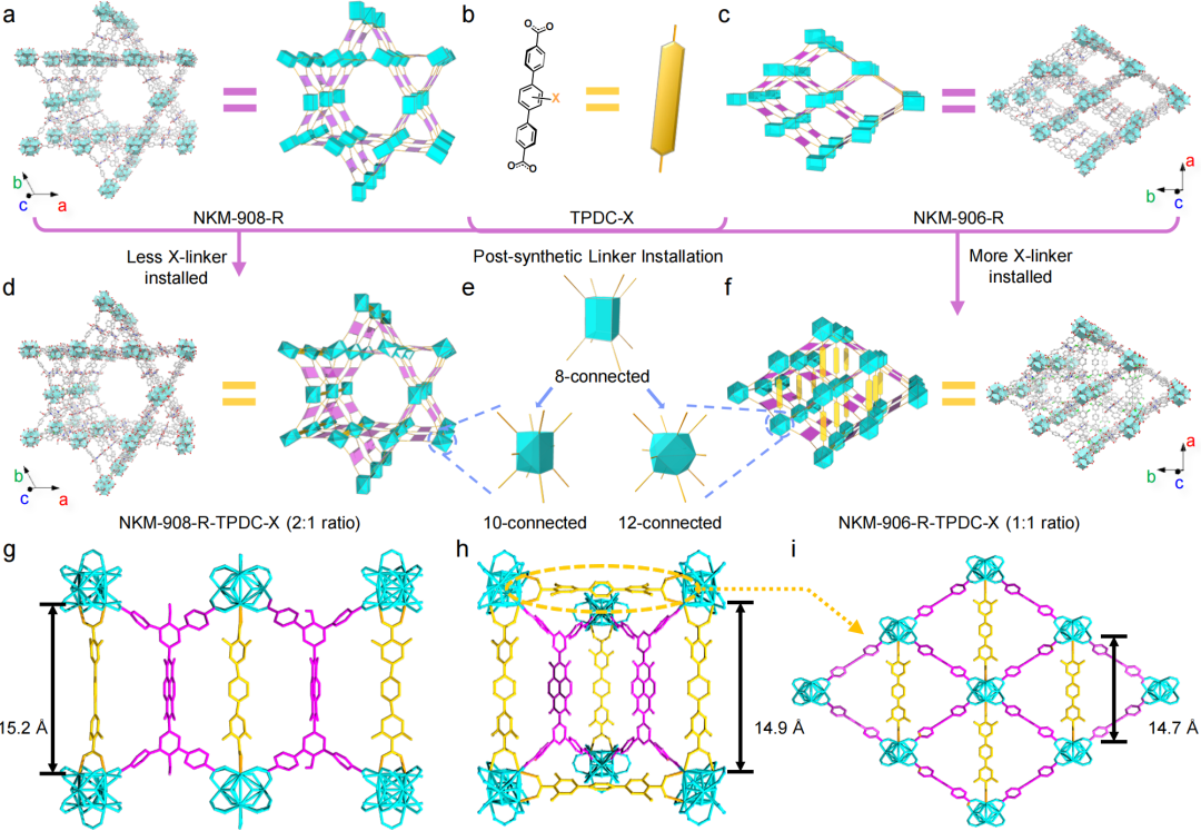 图2 (a)NKM-908-OH,(b)X-辅助配体,(c)NKM-906-H,(d)NKM-908-OMe-TPDC-4F,(e)Zr6O8节点的不同连接模式和(f)NKM-906-H-TPDC-4F的结构和相应的简化单元/拓扑。(g)NKM-908-OMe-TPDC-4F内的口袋-I、(h)NKM-906-h-TCP-4F内的口袋-I和(I)口袋-II的晶体结构示意图。为了清楚起见,省略了氢原子,每个无序部分只显示了一种构象。括号中的数字表示安装后理想的nR:nX摩尔比。