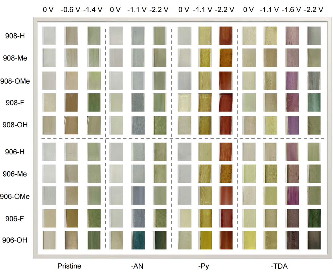通过原位溶剂热法,分别制备了均匀、致密且比例可控的40种不同的NKM-908-R/NKM-906-R/NKM-908-R-TPDC-X/NKM-906-R-TPDC-X ITO薄膜。电致变色行为通过使用三电极电解池评估,所有40个MOF薄膜都表现出良好的准可逆氧化还原行为,并呈现出明显和多样的电致变色颜色变化。