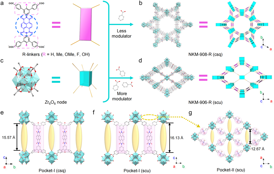 图1 单晶结构和相应的简化单元/拓扑结构(a)R-配体(粉红色原子:简化的R-基团;蓝色框架:NDI核心;粉红色框架:“可修改的外围区域”),(b)NKM-908-OH,(c)Zr6O8节点和(d)NKM-906-H。(e)NKM-908-R内的一种配位不饱和口袋。(f,g)NKM-906-R内的两种配位非饱和口袋。Zr-Zr距离为在减去两端Zr原子的晶体学范德华半径(2.3Å)后测得。