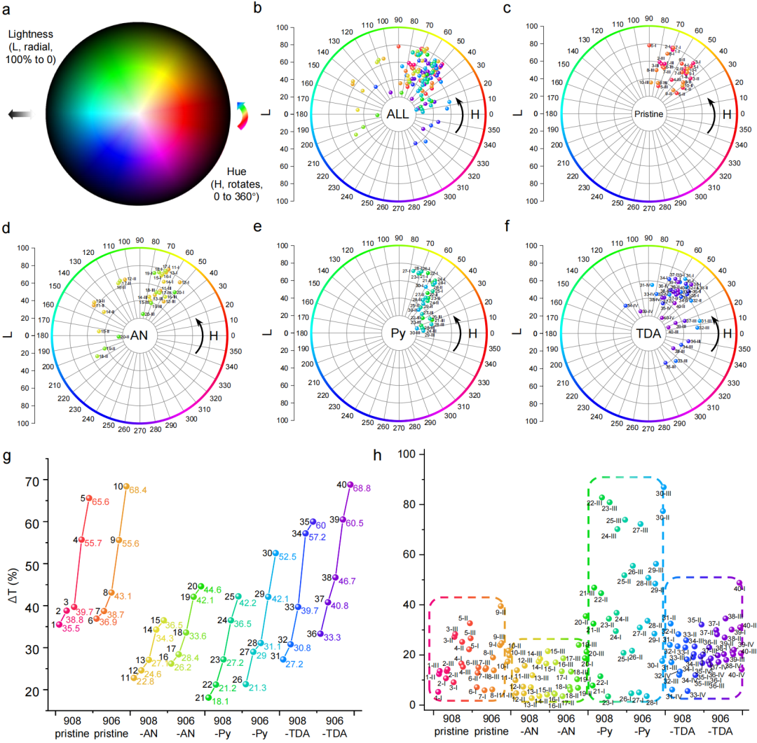 图5(a)表示HSL双锥模型表面的2D色轮图(全部处于完全饱和状态)。(b)所有40个MOF的HL值分布,以及相应的(c)NKM-908-R和NKM-906-R,(d)插入TPDC-AN后的MOF,(e)插入TPDC-Py后的MOF和(f)插入TPDC-TDA安装的MOF的HL值。(g)分组ΔT线图,显示40个MOF内ΔT的演变趋势。(h)所有40个MOF的S值分布。(为简洁起见,上图中MOF以阿拉伯数字标记,氧化还原阶段以罗马数字标记。