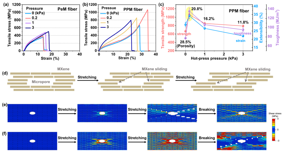 图3 | 微孔调控MXene/PEDOT:PSS/聚轮烷 (PPM) 纤维的力学性能。 (a) MXene/PEDOT:PSS (PeM) 和 (b) PPM 纤维在热压压力分别为0 kPa、0.2 kPa、1 kPa和3 kPa下制备的代表性应力-应变曲线。(c) 孔隙率为28.5%、20.8%、16.2%和11.8%的PPM纤维的拉伸强度、韧性和延展性比较。误差棒代表平均值 ± 标准差(n = 5次独立实验)。(d) 提出的机制示意图:微孔为PPM纤维中MXene的滑动提供了空间。有限元模拟在单轴拉伸载荷下,具有 (e) 可滑动界面和 (f) 不可滑动界面的层状多孔MXene纤维的应力分布。