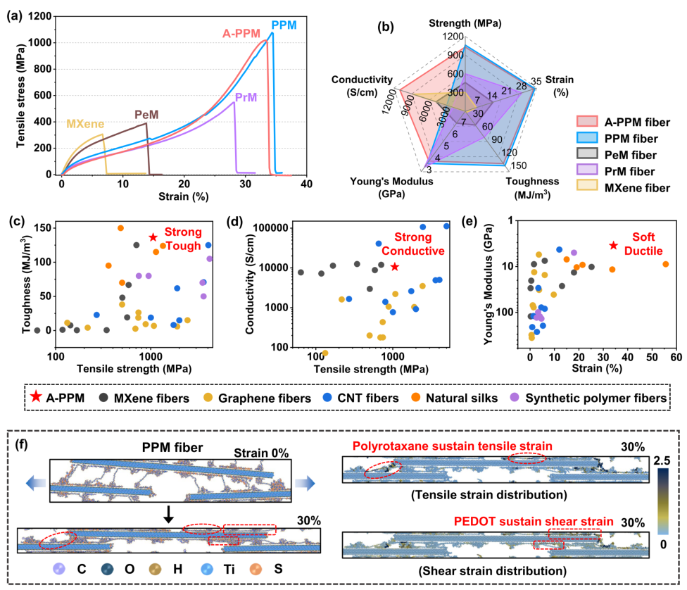图2 | 双界面调控的MXene/PEDOT:PSS/聚轮烷 (PPM) 纤维的力学性能。 (a) MXene、MXene/PEDOT:PSS (PeM)、MXene/聚轮烷 (PrM)、PPM以及涂覆银纳米线网络的PPM纤维 (A-PPM) 的典型应力-应变曲线。(b) MXene、PeM、PrM、PPM和A-PPM纤维的力学和电学性能雷达图。(c) A-PPM纤维与其他常规纤维的韧性-拉伸强度、(d) 电导率-拉伸强度以及 (e) 杨氏模量-应变Ashby图。所用数据总结于补充表1。(f) PPM纤维的分子动力学模拟快照和应变分布。红色虚线圆圈突出了承担集中应变的分子运动。
