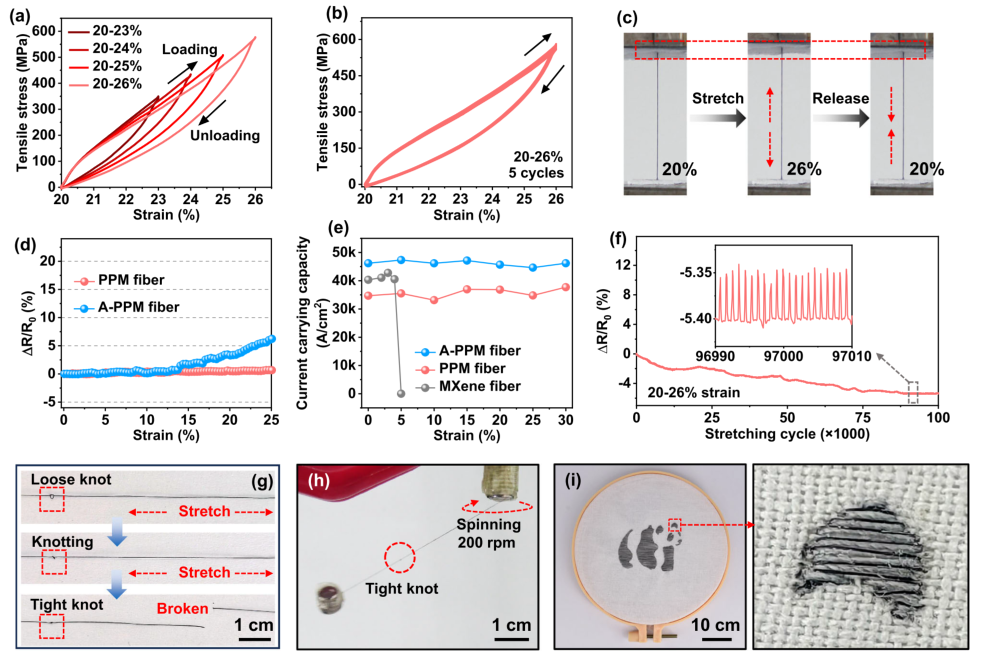 图4 | PPM和A-PPM纤维的弹性与耐久性。 (a) 初始预拉伸至20%应变的A-PPM纤维,再拉伸至23%-26%应变时的加载-卸载拉伸曲线。(b) A-PPM纤维在20%至26%拉伸应变之间进行五次加载-卸载循环的曲线。(c) 一段3厘米长的A-PPM纤维从20%应变拉伸至26%应变,然后恢复至20%应变的照片。(d) PPM和A-PPM纤维的相对电阻变化随拉伸应变的变化。(e) 纯MXene、PPM和A-PPM纤维的载流能力随拉伸应变的变化。(f) A-PPM纤维在20%至26%应变之间进行10万次拉伸-释放循环过程中的相对电阻变化。(g) 打结的A-PPM纤维被拉伸形成紧结,并在远离结点的位置断裂的照片。红色矩形突出了结点的位置。(h) 一段打紧结的6厘米长A-PPM纤维,提起超过自身重量12000倍的重物并以200 rpm旋转的照片。红色圆圈突出了结点的位置。(i) 由A-PPM纤维和棉纤维刺绣而成的熊猫图案照片。