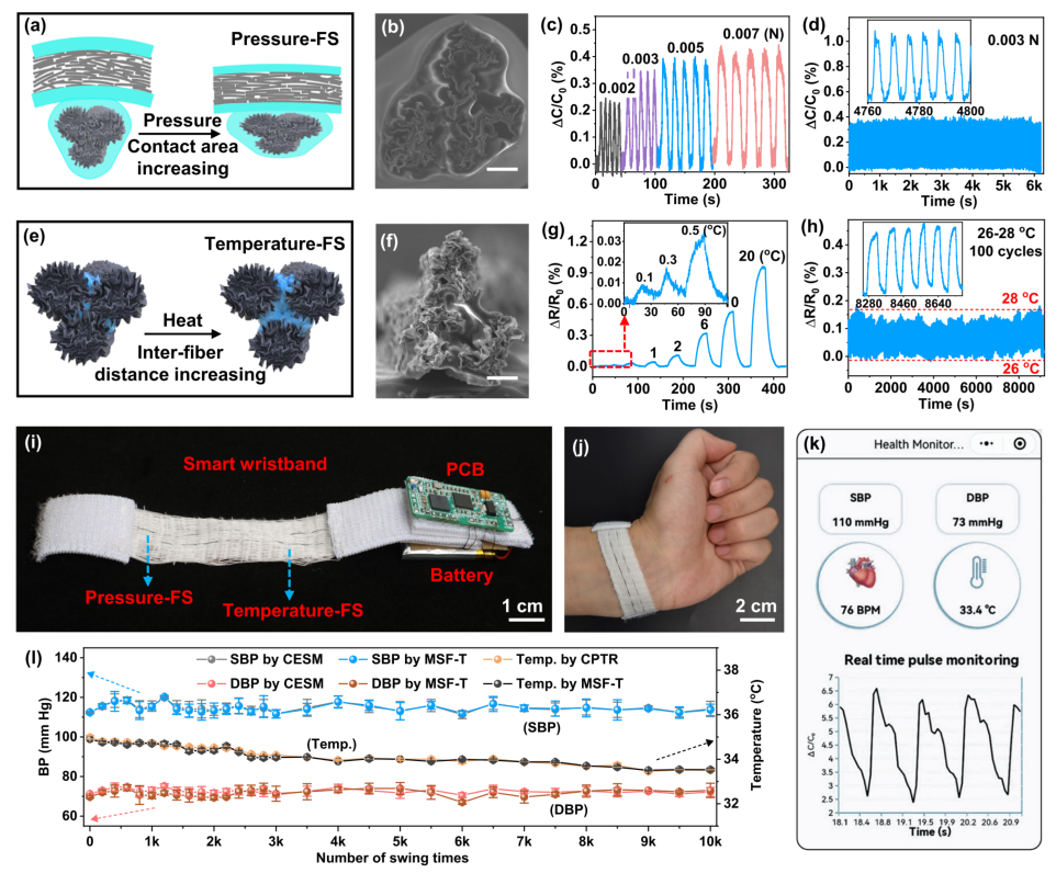 图5 | 传感纤维、智能纺织品及健康监测应用。 (a) 基于A-PPM纤维的压力敏感纤维传感器(Pressure-FS)的结构和传感机制示意图。(b) Pressure-FS的横截面SEM图像(独立重复5次,结构相似)。比例尺为30 μm。(c) Pressure-FS在0.002–0.007 N力范围内随时间变化的相对电容变化。(d) Pressure-FS在0.003 N载荷下进行1000次压力加载-卸载循环的相对电容变化。插图:记录在4760秒至4800秒之间的详细电容变化曲线。(e) 基于A-PPM纤维的温度敏感纤维传感器(Temperature-FS)的结构和传感机制示意图。(f) Temperature-FS的横截面SEM图像(独立重复5次,结构相似)。比例尺为30 μm。(g) Temperature-FS在温度从0.1 °C变化到20 °C时随时间变化的相对电阻变化。(h) Temperature-FS在26 °C和28 °C之间进行100次加热和冷却循环的相对电阻变化。(i) 集成了Pressure-FS、Temperature-FS、信号处理电路和电池的智能腕带照片。(j) 佩戴在人手腕上的智能腕带照片,用于 (k) 实时监测生理信号(包括动脉脉搏波形、血压和皮肤温度),并传输至定制智能手机应用程序显示。(l) 志愿者佩戴智能腕带挥动羽毛球拍超过10000次过程中测量的血压和皮肤温度信号。信号同时由医用级商用袖带式电子血压计(CESM)和无纸温度记录仪(CPTR)测量。误差棒代表平均值 ± 标准差(n = 4次独立实验)。