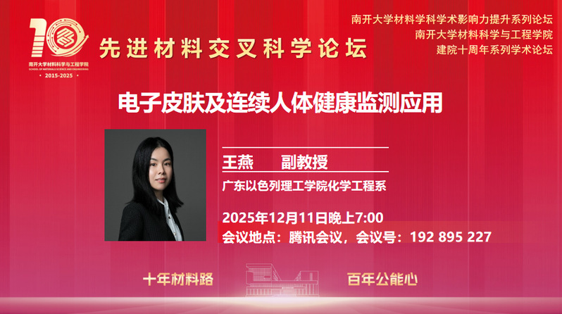 报告人简介:王燕,以色列理工学院中国校区——广东以色列理工学院(GTIIT)化学工程系长聘副教授、独立PI及博士生导师。2021年11月加入该校。她2018年博士毕业于澳大利亚蒙纳士大学,2021年于日本东京大学电子电工系完成博士后研究。在电子皮肤领域,王博士发表论文60余篇,其中以一作/通讯作者身份在Science Advances (3篇), Nature Communications, PNAS, Chemical Society Reviews, and Advanced Materials发表高水平论文40余篇;H指数34,ESI高被引论文5篇;多项澳大利亚/日本/美国/中国专利;入选全球前2%顶尖科学家榜单 (2021-2025)、广东省重大人才工程青年项目(2024)、美国化学会表界面科学女性科学家奖(2025)、英国皇家化学会JMCC期刊新锐科学家(2025)、英国皇家化学会Nanoscale期刊新锐科学家(2022)及国家优秀自费职工奖学金(2018,全球每年500人)等荣誉。其成果被CNN、Science、澳大利亚《Herald Sun》及日本《日刊工业新闻》等国际知名媒体报道。在GTIIT,王燕课题组致力于柔性材料设计与可穿戴电子开发,推动其在健康医疗及物联网等领域的应用。