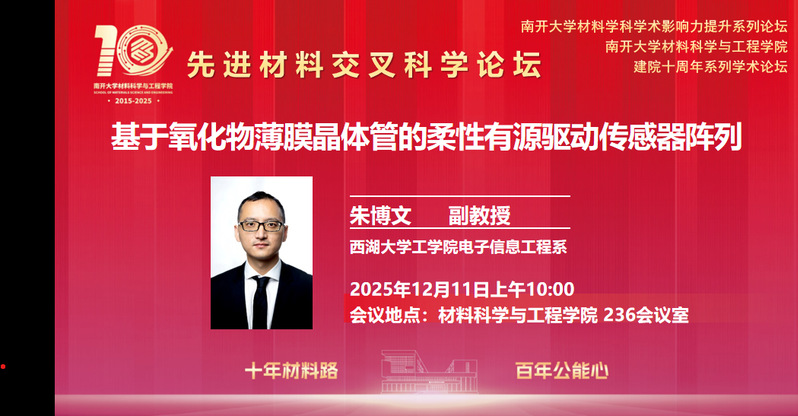 报告人简介:朱博文,西湖大学工学院特聘研究员,电子信息工程系副教授。2010年本科毕业于吉林大学,2016年博士毕业于新加坡南洋理工大学。2016-2017年在加州大学洛杉矶分校材料科学与工程系进行博士后研究。2017-2019年作为澳大利亚DECRA Fellowship在蒙纳士大学化学工程系开展柔性及可拉伸电子方向研究。2019年8月作为独立PI加入西湖大学工学院,为薄膜电子实验室负责人,分别获得国家及浙江省海外高层次人才青年项目、浙江省“钱江人才计划”等项目支持,曾获得MIT Technology Review亚太区科技创新35人,Clarivate 2024“高被引学者”等荣誉。目前发表SCI收录论文90余篇,获引用9000余次。课题组主要从事于薄膜电子材料和器件的研究,主要研究方向包括:(1) 基于氧化物薄膜晶体管的有源驱动(Active-Matrix)传感器阵列;(2) 基于人工神经元、突触等神经形态器件的感知电子系统。