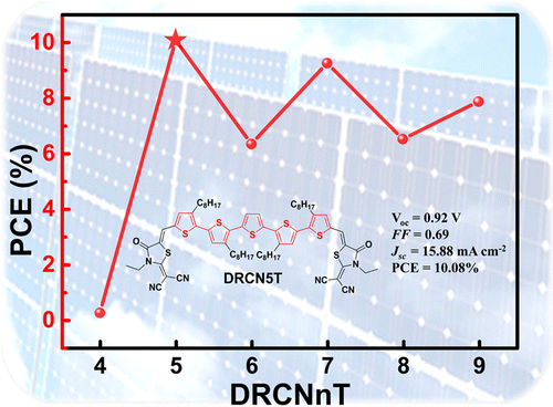 A series of acceptor–donor–acceptor simple oligomer-like small molecules based on oligothiophenes, namely, DRCN4T–DRCN9T, were designed and synthesized. Their optical, electrical, and thermal properties and photovoltaic performances were systematically investigated. Except for DRCN4T, excellent performances were obtained for DRCN5T–DRCN9T. The devices based on DRCN5T, DRCN7T, and DRCN9T with axisymmetric chemical structures exhibit much higher short-circuit current densities than those based on DRCN6T and DRCN8T with centrosymmetric chemical structures, which is attributed to their well-developed fibrillar network with a feature size less than 20 nm. The devices based on DRCN5T/PC71BM showed a notable certified power conversion efficiency (PCE) of 10.10% under AM 1.5G irradiation (100 mW cm–2) using a simple solution spin-coating fabrication process. This is the highest PCE for single-junction small-molecule-based organic photovoltaics (OPVs) reported to date. DRCN5T is a rather simpler molecule compared with all of the other high-performance molecules in OPVs to date, and this might highlight its advantage in the future possible commercialization of OPVs. These results demonstrate that a fine and balanced modification/design of chemical structure can make significant performance differences and that the performance of solution-processed small-molecule-based solar cells can be comparable to or even surpass that of their polymer counterparts.