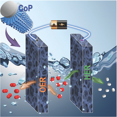 Water splitting for the production of hydrogen and oxygen is an appealing solution to advance many sustainable and renewable energy conversion and storage systems, while the key fact depends on the innovative exploration regarding the design of efficient electrocatalysts. Reported herein is the growth of CoP mesoporous nanorod arrays on conductive Ni foam through an electrodeposition strategy. The resulting material of well-defined mesoporosity and a high specific surface area (148 m2 g−1) can be directly employed as a bifunctional and flexible working electrode for both hydrogen and oxygen evolution reactions, showing superior activities as compared with noble metal benchmarks and state-of-the-art transition-metal-based catalysts. This is intimately related to the unique nanorod array electrode configuration, leading to excellent electric interconnection and improved mass transport. A further step is taken toward an alkaline electrolyzer that can achieve a current density of 10 mA cm−2 at a voltage around 1.62 V over a long-term operation, better than the combination of Pt and IrO2. This development is suggested to be readily extended to obtain other electrocatalysis systems for scale-up water-splitting technology.