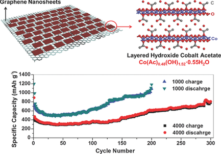 The dramatically increasing demand of high-energy lithium-ion batteries (LIBs) urgently requires advanced substitution for graphite-based anodes. Herein, inspired from the extra capacity of lithium storage in solid-electrolyte interface (SEI) films, layered hydroxide cobalt acetates (LHCA, Co(Ac)0.48(OH)1.52·0.55H2O) are introduced as novel and high-efficiency anode materials. Furthermore, ultrathin LHCA nanoplates are face-to-face anchored on the surface of graphene nanosheets (GNS) through a facile solvothermal method to improve the electronic transport and avoid agglomeration during repeated cycles. Profiting from the parallel structure, LHCA//GNS nanosheets exhibit extraordinary long-term and high-rate performance. At the current densities of 1000 and 4000 mA g−1, the reversible capacities maintain ≈1050 mAh g−1 after 200 cycles and ≈780 mAh g−1 after 300 cycles, respectively, much higher than the theoretical value of LHCA according to the conversion mechanism. Fourier transform infrared spectroscopy confirms the conversion from acetate to acetaldehyde after lithiation. A reasonable mechanism is proposed to elucidate the lithium storage behaviors referring to the electrocatalytic conversion of OH groups with Co nanocatalysts. This work can help further understand the contribution of SEI components (especially LiOH and LiAc) to lithium storage. It is envisaged that layered transition metal hydroxides can be used as advanced materials for energy storage devices.