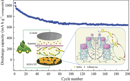 Carbon materials have attracted extensive attention as the host materials of sulfur for lithium–sulfur battery, especially those with 3D architectural structure. Here, a novel 3D graphene nanosheet–carbon nanotube (GN–CNT) matrix is obtained through a simple one-pot pyrolysis process. The length and density of CNTs can be readily tuned by altering the additive amount of carbon source (urea). Specifically, CNTs are in situ introduced onto the surface of the graphene nanosheets (GN) and show a stable covalent interaction with GN. Besides, in the GN–CNT matrix, cobalt nanoparticles with different diameters exist as being wrapped in the top of CNTs or scattering on the GN surface, and abundant heteroatoms (N, O) are detected, both of which can help in immobilizing sulfur species. Such a rationally designed 3D GN–CNT matrix makes much more sense in enhancing the electrochemical performance of the sulfur cathode for rapid charge transfer and favorable electrolyte infiltration. Moreover, the presence of dispersed cobalt nanoparticles is beneficial for trapping lithium polysulfides by strong chemical interaction, and facilitating the mutual transformation between the high-order polysulfides and low-order ones. As a result, the S/GN–CNT composite presents a high sulfur utilization and large capacity on the basis of the S/GN–CNT composite as active material.