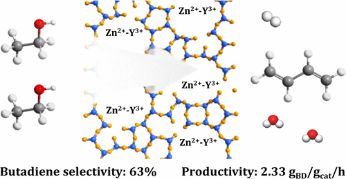 The one-pot conversion of ethanol to butadiene is a promising route for butadiene production; however, simultaneous attainment of high butadiene productivity and high butadiene selectivity is challenging. Here, zeolite-confined bicomponent Zn–Y clusters were constructed and applied as robust catalysts for ethanol-to-butadiene conversion with a state-of-the-art butadiene productivity of 2.33 gBD/gcat/h and butadiene selectivity of ∼63%. Structural confinement effects are responsible for the enhanced butadiene production efficiency via a multiple-step cascade reaction.