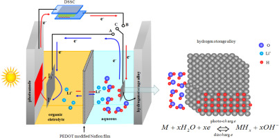 Solar water splitting is an effective approach to hydrogen production and application of solar energy. However, the photo-generated hydrogen should be initially stored in high pressure cylinder and subsequently applied in hydrogen-oxygen fuel cells. Herein, a solar rechargeable battery is proposed based mainly on hydrogen storage mechanism in dual-phase electrolyte. Specifically, the hydrogen production, storage and utilization are integrated into a hybrid system of the dye-sensitized solar cell and electrochemical cell with the dye-sensitized TiO2 as photo-anode, LiI as the cathode active material in organic electrolyte, AB5-type hydrogen storage alloy as anode in alkaline solution, and PEDOT-modified Nafion membrane as separator. Here, the photo-generated electrons in organic electrolyte pass to the AB5-type hydrogen storage alloy to split water in alkaline aqueous electrolyte for generating hydrogen, which is in situ stored into AB5-type hydrogen storage alloy. Subsequently, the hydrogen stored in the AB5-type hydrogen storage alloy can be oxidized by electrochemical way to generate electricity, coupled with LiI cathode in organic electrolyte. The solar rechargeable battery demonstrates a new solution of the solar energy conversion, hydrogen production, storage, and utilization, achieving the new energy conversion and storage from solar energy to chemical energy, and further to electrical energy.