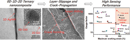 The development of strain sensors with both large strain range (>50%) and high gauge factor (>100) is a grand challenge. High sensitivity requires material to perform considerable structural deformation under tiny strain, whereas high stretchability demands structural connection or morphological integrity for materials upon large deformation, yet both features are hard to be achieved in one thin film. A new 0D–1D–2D ternary nanocomposite–based strain sensor is developed that possesses high sensitivity in broad working strain range (gauge factor 2392.9 at 62%), low hysteresis, good linearity, and long‐term durability. The skin‐mountable strain sensor, fabricated through one‐step screen‐printing process, is made of 1D silver nanowire offering high electrical conductivity, 2D graphene oxide offering brittle layered structure, and 0D fullerene offering lubricity. The fullerene constitutes a critical component that lowers the friction between graphene oxide–based layers and facilitates the sliding between adjacent layers without hurting the brittle nature of the nanocomposite film. When stretching, layer slippage induced by fullerene can accommodate partial applied stress and boost the strain, while cracks originating and propagating in the brittle nanocomposite film ensure large resistance change over the whole working strain range. Such high comprehensive performance renders the strain sensor applicable to full‐spectrum human motion detection.