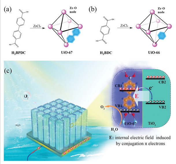 Photoanode material with high efficiency and stability is extensively desirable in photoelectrochemical (PEC) water splitting for green/renewable energy source. Herein, novel heterostructures is constructed via coating rutile TiO2 nanorods with metal organic framework (MOF) materials UiO-66 or UiO-67 (UiO-66@TiO2 and UiO-67@TiO2), respectively. The pi electrons in the MOF linkers could increase the local electronegativity near the heterojunction interface due to the conjugation effect, thereby enhancing the internal electric field (IEF) at the heterojunction interface. The IEF could drive charge transfer following Z-scheme mechanism in the prepared heterostructures, inducing photogenerated charge separation efficiency increasing as 156% and 253% for the UiO-66@TiO2 and UiO-67@TiO2, respectively. Correspondingly, the UiO-66@TiO2 and UiO-67@TiO2 enhanced the photocurrent density as approximate two- and threefolds compared with that of pristine TiO2 for PEC water oxidation in universal pH electrolytes. This work demonstrates an effective method of regulating the IEF of heterojunction toward further improved charge separation.
