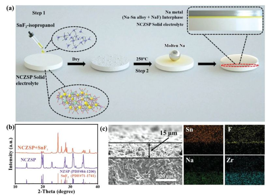 Solid-state sodium batteries have garnered considerable interest. However, their electrochemical performance is hampered by severe interfacial resistance between sodium metal and inorganic solid electrolytes, as well as Na dendrite growth within the electrolytes. To address these issues, a uniform and compact SnF2 film is first introduced onto the surface of the inorganic solid electrolyte Na3.2Zr1.9Ca0.1Si2PO12 (NCZSP) to improve contact through an effective and straightforward process. Through experiments and computations, the in situ conversion reaction between SnF2 and molten Na is adequately confirmed, resulting in a composite conductive layer containing NaxSn alloys and NaF at the interface. As a result, the interfacial resistance of Na/NCZSP is significantly decreased from 813 to 5 Ω cm2, and the critical current density is dramatically increased to 1.8 mA cm−2, as opposed to 0.2 mA cm−2 with bare NCZSP. The symmetric cell is able to cycle stably at 0.2 mA cm−2 for 1300 h at 30 °C and exhibits excellent current tolerance of 0.3 and 0.5 mA cm−2. Moreover, the Na3V2(PO4)3/SnF2-NCZSP/Na full cell displays excellent rate performance and cycling stability. The SnF2-induced interlayer proves significant in improving interfacial contact and restraining sodium dendrite propagation, thus promoting the development of solid-state sodium batteries.