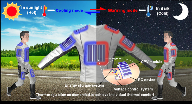 The human body must stay within a certain temperature range for comfort and safety. However, challenges for thermoregulatory clothing exist for harsh application scenarios, such as full day/night cycles, frigid polar regions, and space travel. We developed a flexible and sustainable personal thermoregulatory clothing system by integrating a flexible organic photovoltaic (OPV) module to directly acquire energy from sunlight and bidirectional electrocaloric (EC) devices. The flexible OPV-EC thermoregulatory clothing (OETC) can extend the human thermal comfort zone from 22°–28°C to 12.5°–37.6°C with a fast thermoregulation rate. The low energy consumption and high efficiency of the EC device allows for 24 hours of controllable and dual-mode thermoregulation with 12 hours of sunlight energy input. This self-powered wearable thermoregulatory platform has a simple structure, compact design, high efficiency, and strong self-adaptability with sunlight as the sole energy source.