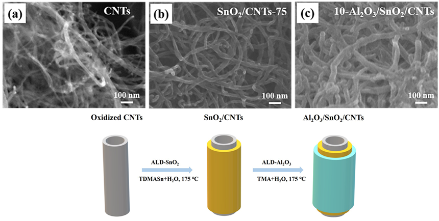 [15] Electrochimica Acta 319, 490-498 (2019), Precise growth of Al2O3/SnO2/CNTs composites by a two-step atomic layer deposition and their application as an improved anode for lithium ion batteries.